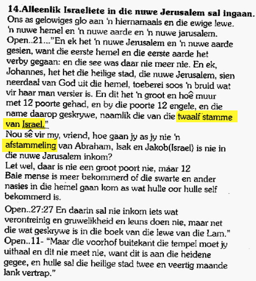 Alleenlik Israeliete in die nuwe Jerusalem sal ingaan.Ons as gelowiges glo aan ‘n hiernamaals en die ewige lewe. ‘n nuwe hemel en ‘n nuwe aarde en ‘n nuwe jarusalem. Open..21…”En ek het ‘n nuwe Jerusalem en ‘n nuwe aarde gesien, want die eerste hemel en die eerste aarde het verby gegaan: en die see was daar nie meer nie. En ek, Johannes, het het die heilige stad, die nuwe Jerusalem, sien neerdaal van God uit die hemel, toeberei soos ‘n bruid wat vir haar man versier is. En dit het ‘n groot en hoê muur met 12 poorte gehad, en by die poorte 12 engele, en die name daarop geskrywe, naamlik die van die twaalf stamme van Israel.” Nou sê vir my, vriend, hoe gaan jy as jy nie ‘n afstammeling van Abraham, Isak en Jakob(Israel) is nie in die nuwe Jerusalem inkom? Let wel, daar is nie een groot poort nie, maar 12 Baie mense is meer bekommerd of die swarte en ander nasies in die hemel gaan kom as wat hulle oor hulle self bekommerd is. Open..27:27 En daarin sal nie inkom iets wat verontreinig en gruwelikheid en leuns doen nie, maar net die wat geskrywe is in die boek van die lewe van die Lam.” Open..11- “Maar die voorhof buitekant die tempel moet jy uithaal en dit nie meet nie, want dit is aan die heidene gegee, en hulle sal die heilige stad twee en veertig maande lank vertrap.” |
