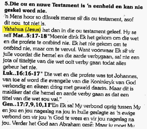 Yahshua (Jesus)Die tweede Persoon van die Drie-Eenheid het inderdaad in die Ou Testament geleef en gewerk Hy het egter nie in die Ou Testament die Naam "Yahshua" of "Jesus" nie. KJVWaarom word die KJV hier aangehaal? Is dit omdat hierdie vertaling sy standpunt beter ondersteun? Watter waarde het die vertaling bo die oorspronklike teks? Ek sal my verbond nie ontheilig nieWaarom word Jeremia 31:31 – 35 nie hier aangehaal nie? Dit word net so in Hebreërs 8 aangehaal? Daar is sprake van ‘n nuwe verbond! |